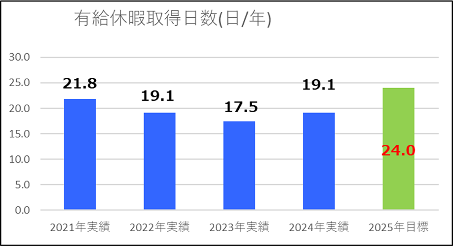 | 1.年次有給休暇取得日数 | 21.8日 | 19.1日 | 17.5日 | 19.1日 | 切り捨てゼロ |