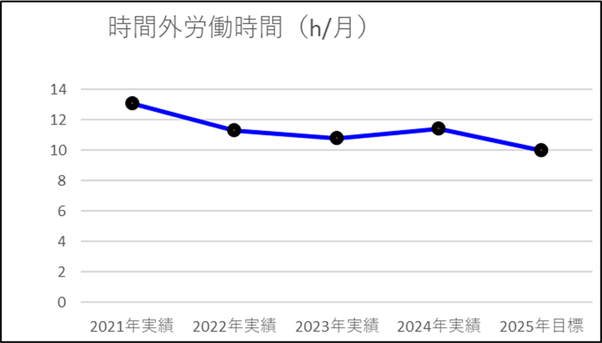 | 2.時間外労働時間の状況 | 13.1h | 11.3h | 10.8h | 11.4h | 10h以下 |